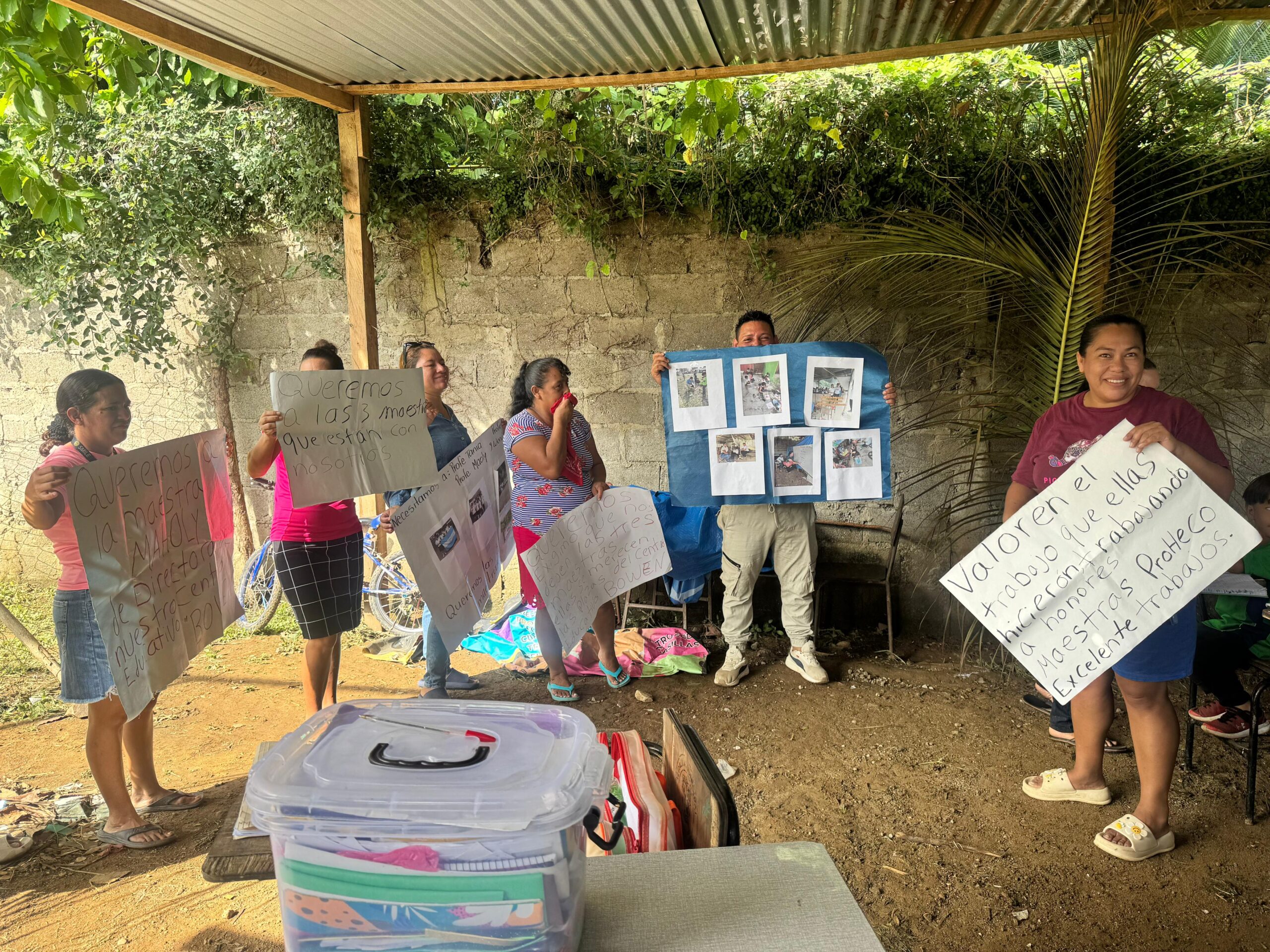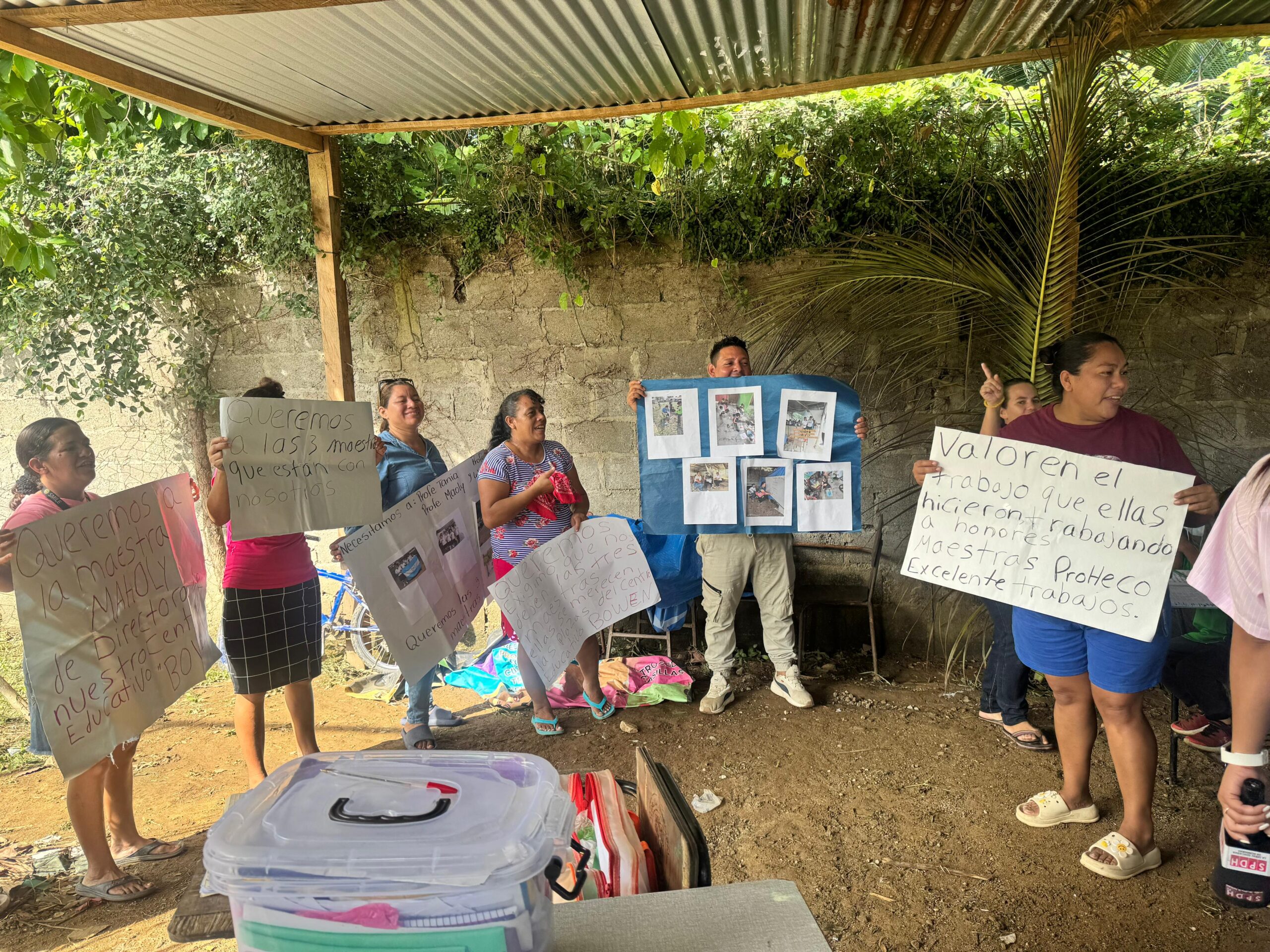 Una de las razones por las que los afectados no quieren la remoción de las maestras es porque ellas estuvieron “bajo lluvia y sol”, debido a que la infraestructura del centro educativo es de nailon, bambú y láminas viejas.